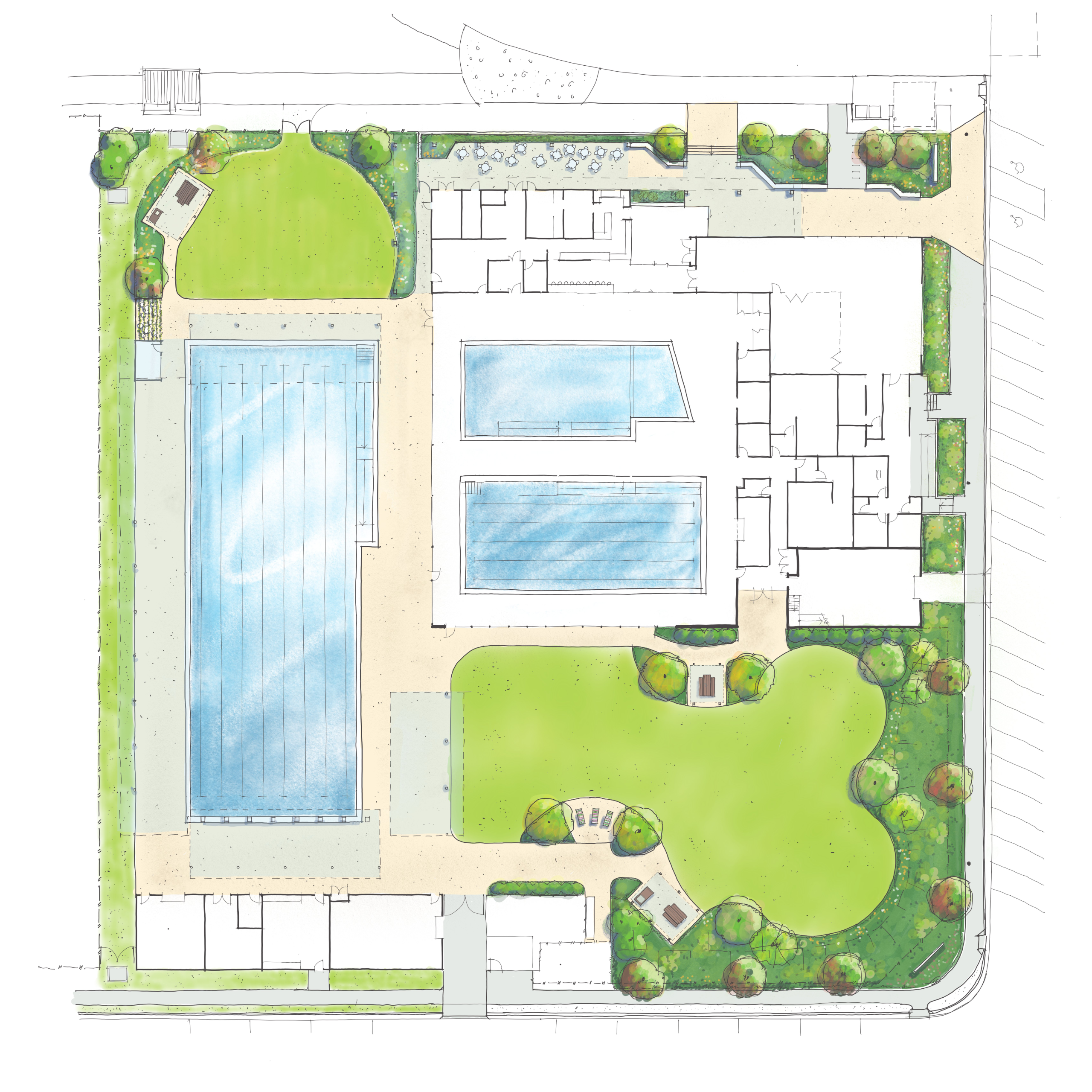 The plan also features flexible spaces for aquatic support areas, allied health and rehabilitation gym areas, café/kiosk, amenities and change areas, outdoor recreation areas, and administration spaces.
