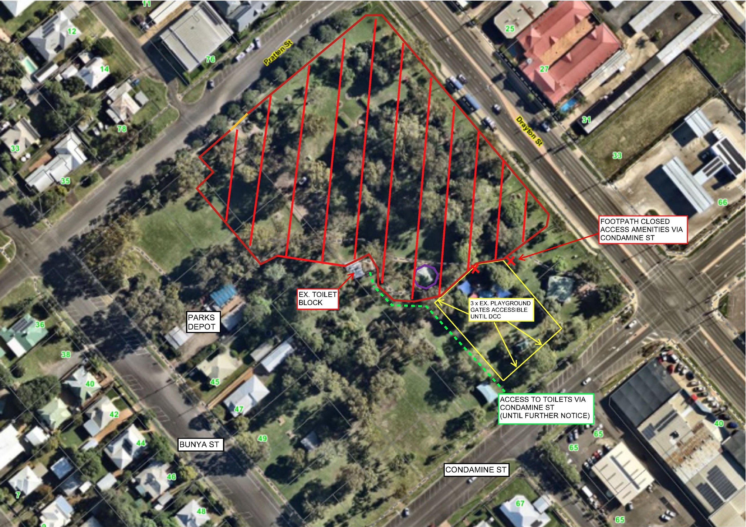 The park's amenities are currently accessible via Condamine and Bunya Streets.
